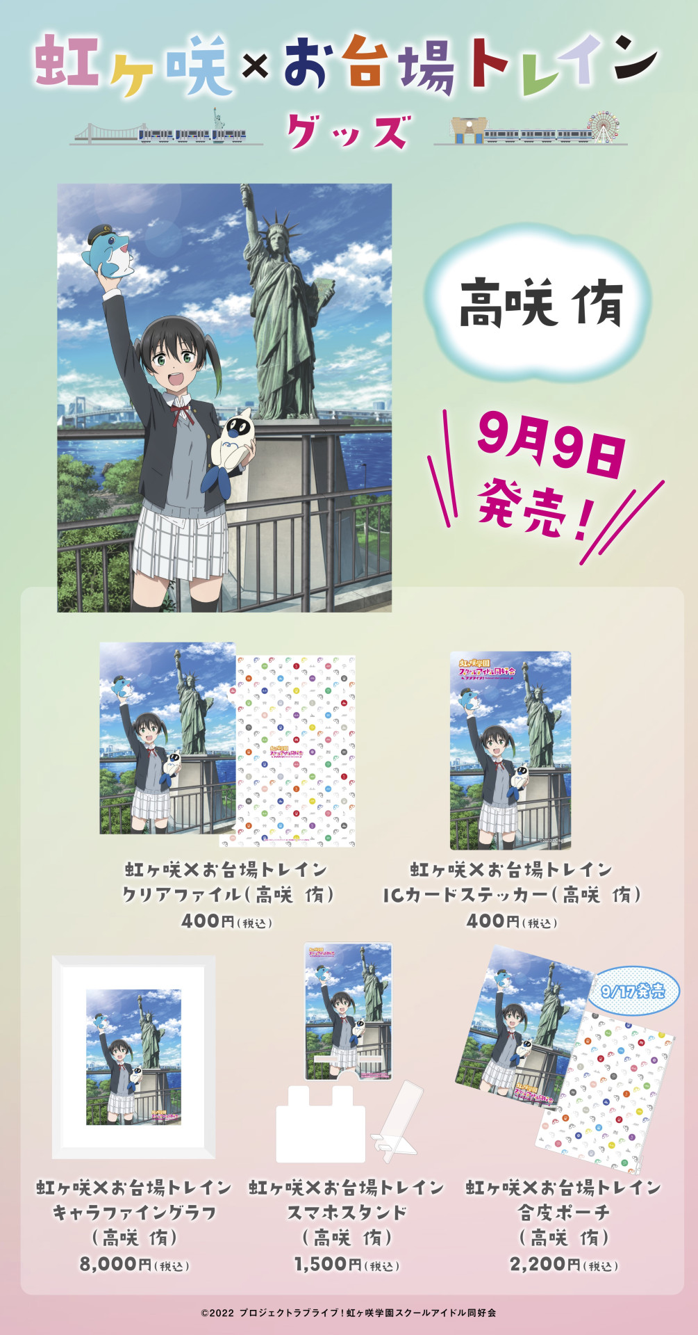 2022年4月にゆりかもめ・りんかい線の各駅に、お台場のシンボル自由の女神像の前でゆりも・りんかるを持っている高咲 侑の描き下ろしポスターが掲出され、多くの方にご好評いただきました!