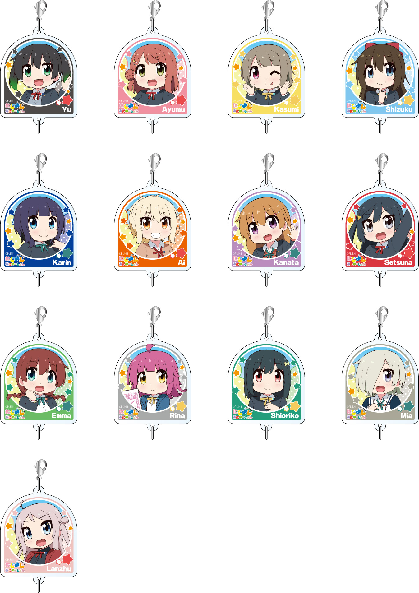 高咲 侑、上原 歩夢、中須 かすみ、桜坂 しずく、朝香 果林、宮下 愛、近江 彼方、優木 せつ菜、エマ・ヴェルデ、天王寺 璃奈、三船 栞子、ミア・テイラー、鐘 嵐珠のイラストを2連ワイヤーアクリルキーホルダーに仕上げました。