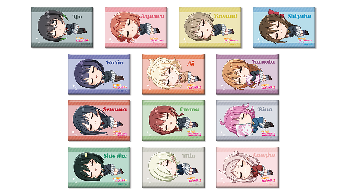 高咲 侑、上原 歩夢、中須 かすみ、桜坂 しずく、朝香 果林、宮下 愛、近江 彼方、優木 せつ菜、エマ・ヴェルデ、天王寺 璃奈、三船 栞子、ミア・テイラー、鐘 嵐珠をスクエア缶バッジに仕上げました。