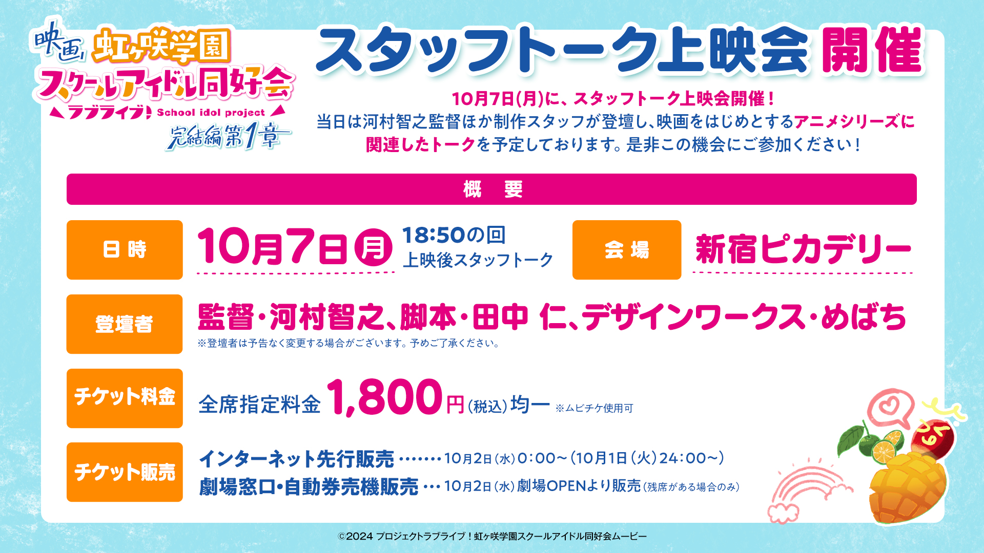 こちらの舞台挨拶では10月19日(土)~20日(日)開催の「ラブライブ!虹ヶ咲学園スクールアイドル同好会 7th Live! NEW TOKIMEKI LAND」についての話題もトーク予定です。
