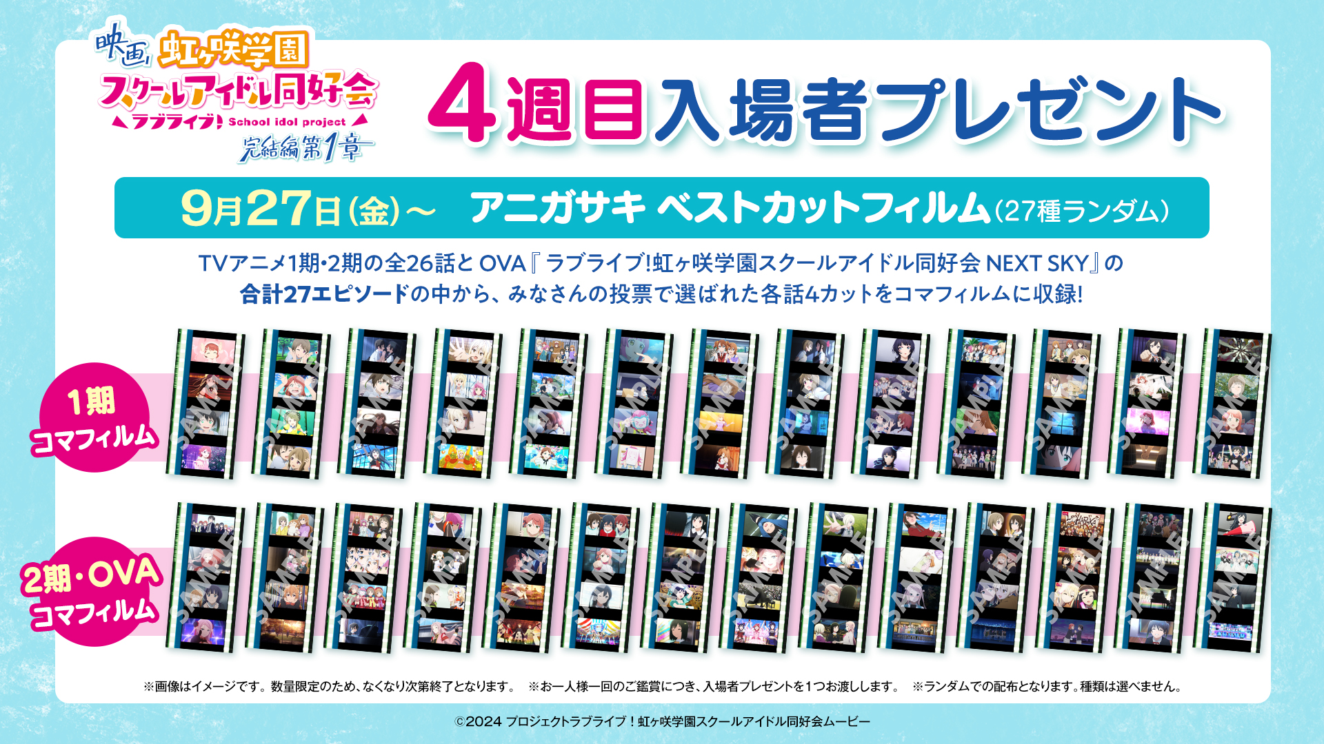 TVアニメ1期・2期のとOVA『ラブライブ!虹ヶ咲学園スクールアイドル同好会 NEXT SKY』の計27エピソードの中から、みなさんの投票で選ばれた各話4カットをコマフィルムに収録しました!