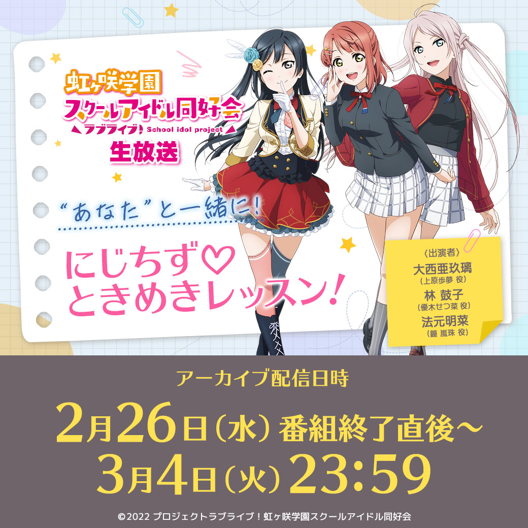 虹ヶ咲学園スクールアイドル同好会より3人のメンバーが出演する生放送番組のお知らせです!